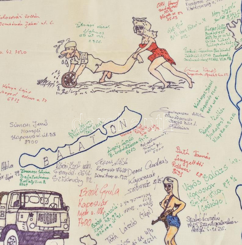 Leírás: 1989 Kaposvár, katona humoros-erotikus emlékrajza, vegyes technika, vászon, számos aláírással, hajtva,103x75 cm