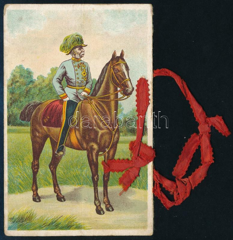 cca 1910 Ferenc József császár és király lovon, színes litográfia, a hátoldalon "Docktor Mondschein" névbejegyzéssel, a szélein kopásnyomokkal, a szélén szalaggal, 12x8 cm.