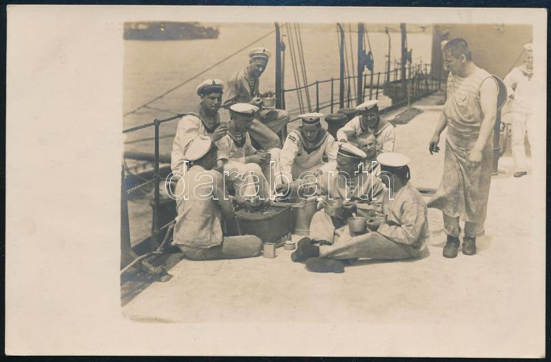 cca 1914 S.M.S. Erzherzog Friedrich osztrák-magyar hadihajó matrózai ebédet főznek a fedélzeten fotólap / Black-and-white privately produced photo postcard published by the Pola Red Cross in 1916. A group of sailors cook their lunch on the deck of S.M.S. Erzherzog Friedrich in Pola.