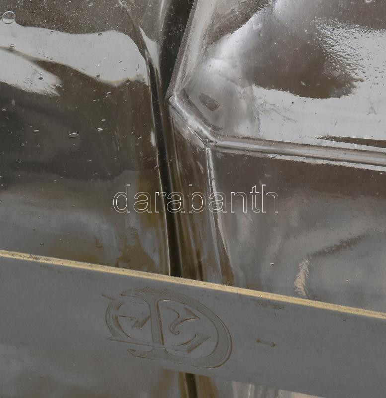 Leírás: Antik asztali italkínáló szett. 2 darab fémkupakos parafadugóval lezárt üveg, kulccsal zárható szerelékkel, oldalán monogrammal.16x8x28 cm