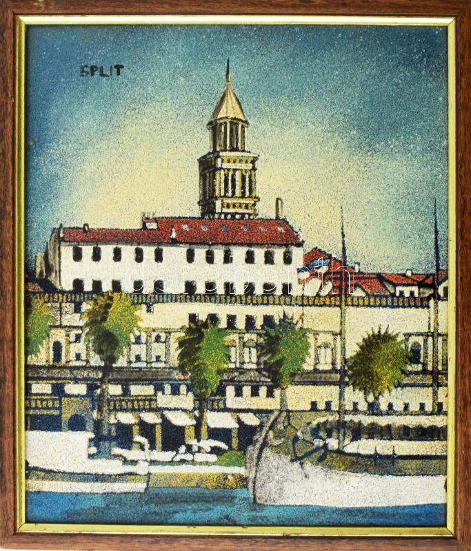 Leírás: Split, kikötő, 1980 körül. Tűzzománc, rézlemez. Fakeretben. 31x26,5 cm