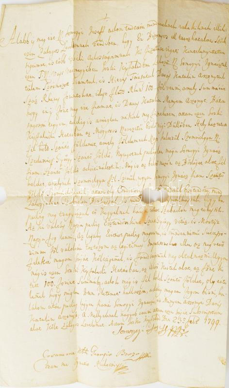 Somogyi József adósságai fejében elzálogosította fiának, Somogyi Ignácnak és menyének, Darás Katalinnak 100 rajnai forintért a település határában található Mogyorós dűlőnél fekvő félhold szántóföldjét. Somogyi József aláírásával és tanúkkal (Borza György, Rádóczi Ignác). Sérült. Magyar nyelvű.