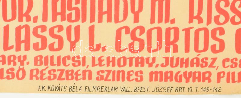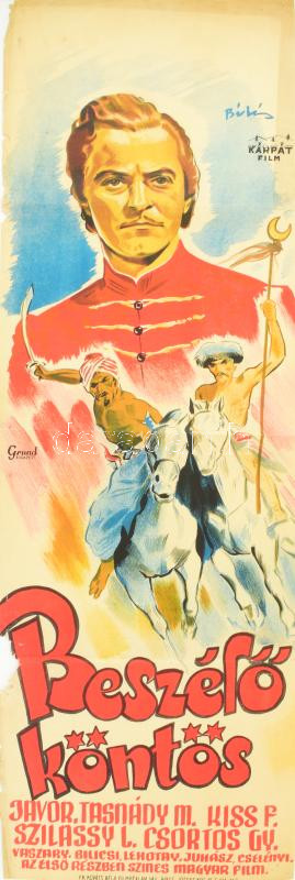 Beszélő köntös 1941. - Az első részben színes magyar film. Moziplakát (filmplakát, rácsplakát). R.: Radványi Géza. Jávor Pál, Tasnády Mária, Csortos Gyula, Vaszary Piri, Bilicsi Tivadar és mások szereplésével. Litográfia, papír. Békés grafikája, jelzett a litográfián. Bp. Kárpát film. Grund Bp. Sérült. 97x31 cm. / Vintage rare Hungarian poster lithograph on paper, with damages
