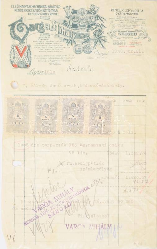 1938 Szeged, Varga Mihály Első Magyar Mechanikai Hálógyár, Kenderkikészítő és Kötél Gyár, Kender és Kócz Kivitel számla, 4 db 5 F okmánybélyeggel, gyűrött, szakadt