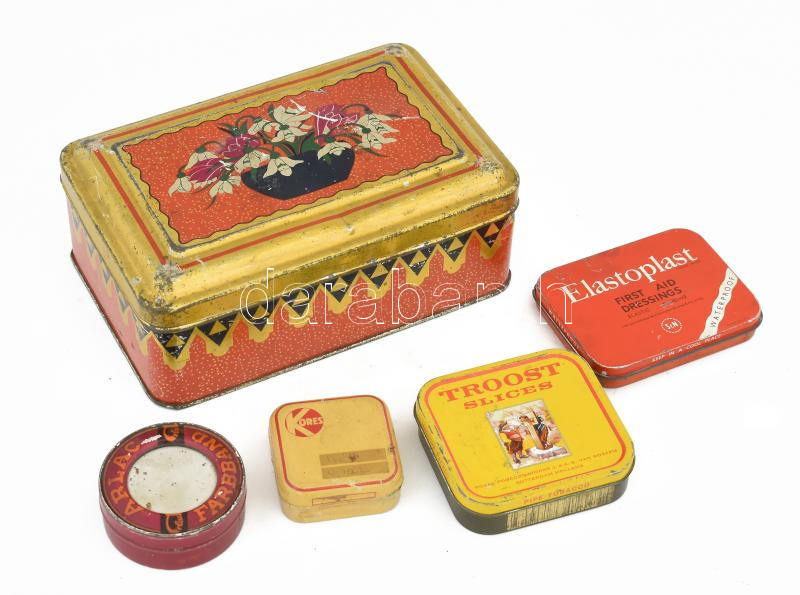Leírás: 5 darab klf méretű fémdoboz, 20x13 cm alatt