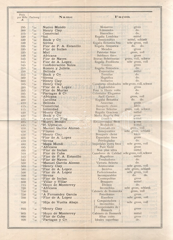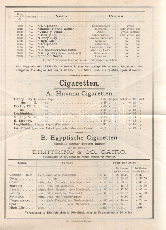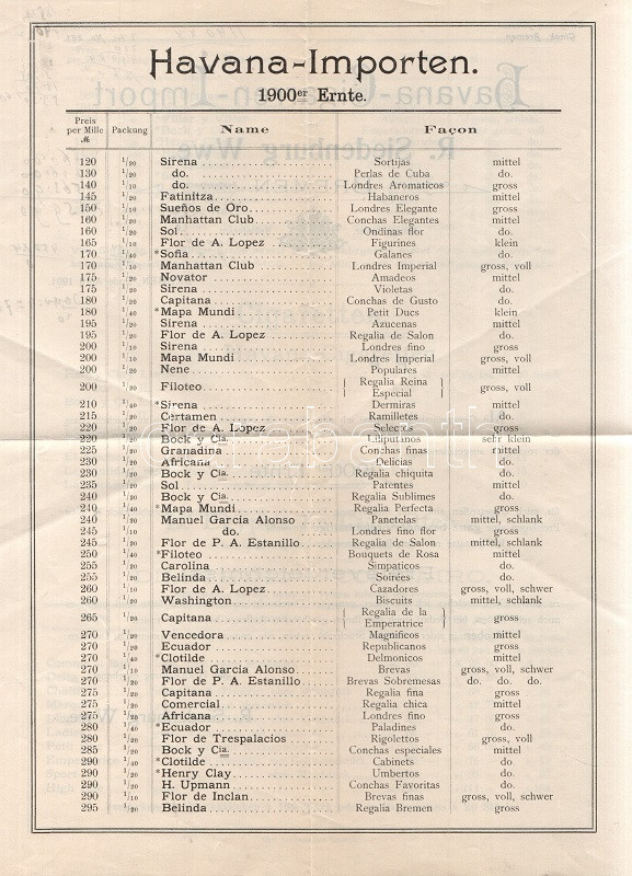 [Dohány, cigaretta.] Bremen, 1901 April. A "Havanna-Cigarren-Import von R. Siedenburg Wwe." cég fejléces, négy oldalas árjegyzéke. Az oldalak mérete: 290x220 mm, első oldalán korabeli, kézzel írt számítások.