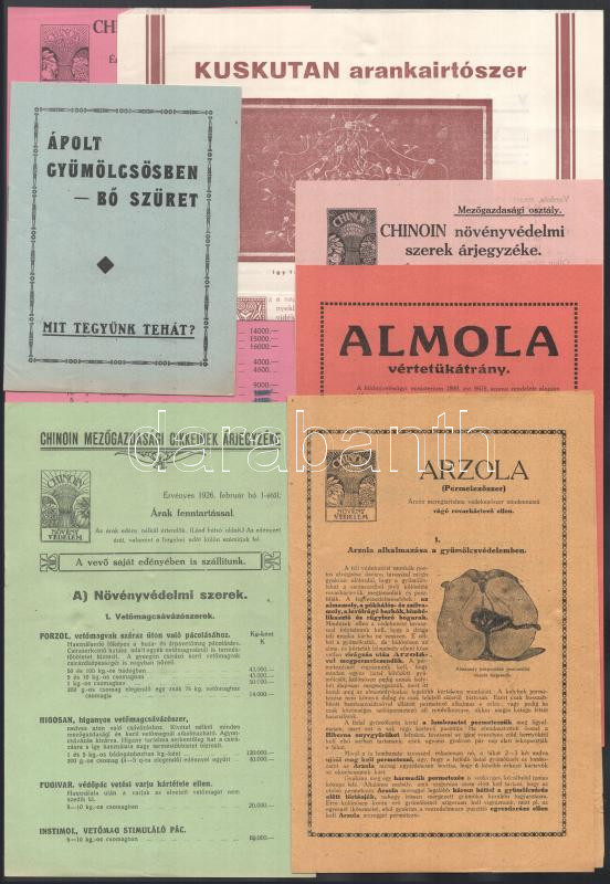 Leírás: cca 1920-1940 Kert, gyümölcstermésztéssel kapcsolatos cikkek reklám nyomtatványai: permetező, ismeretterjesztő, stb össz 6 db