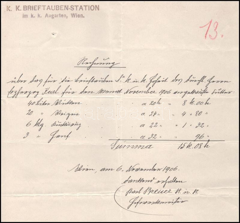 1907 Habsburg Károly, később IV. Károly király részére szóló számla k.u.k. postagalamb állomás pecsétjével /