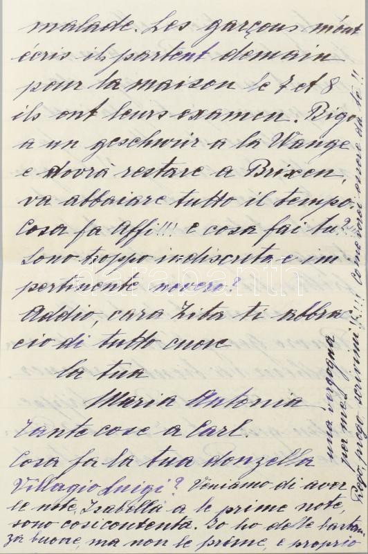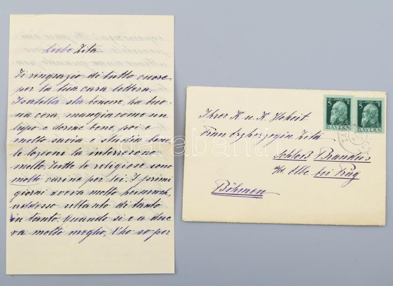 1912 Maria Antonia (1895-1977) pármai hercegnő kézzel írt levele testvérének Pármai Zita főhercegnének. Négy beírt oldal, borítékkal / 1912 Handwritten letter of Princess Maria Antonia (1895-1977) of Parma to her sister Archduchess Zita of Parma. Four pages, with envelope