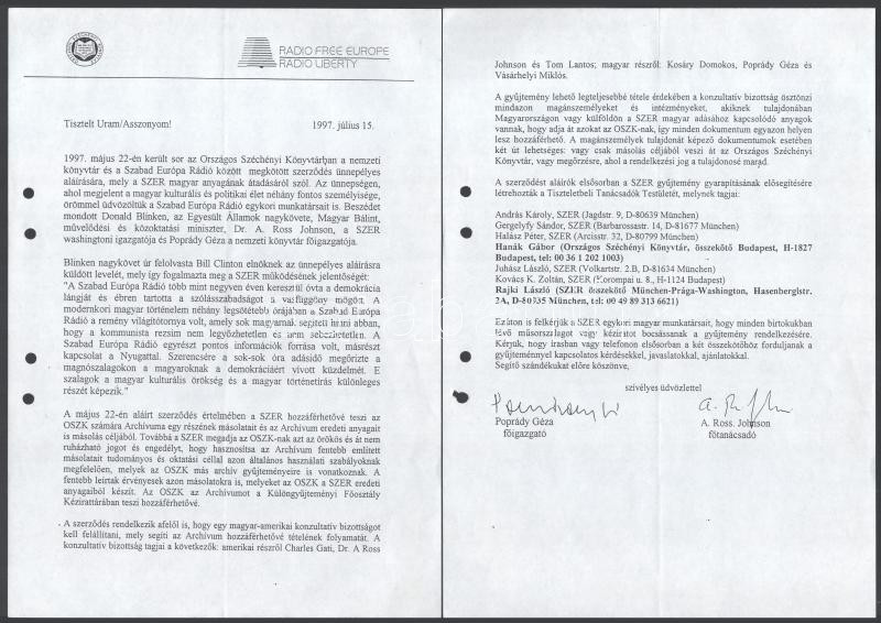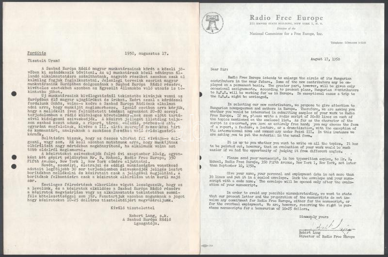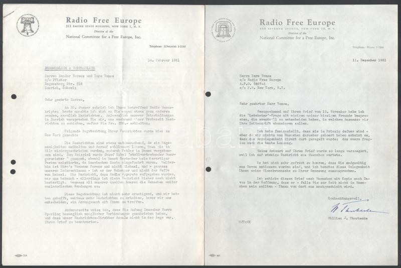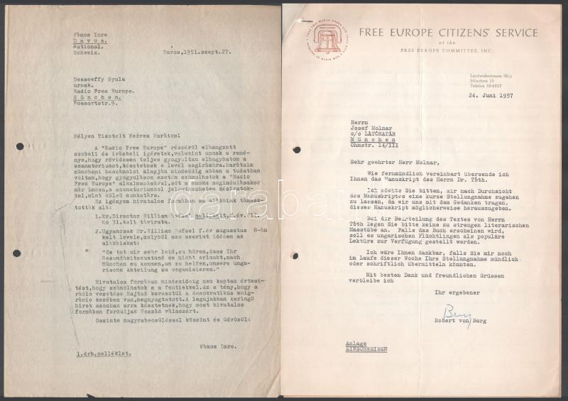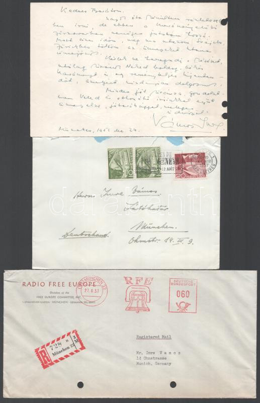 1950-1957-1997 Különféle, nagyrészt Vámos Imrének szóló Szabad Europa Rádiós dokumentumok. Közte egy későbbi, már 1997 dokumentum is. Valamint Vámos Imre (1927-1993) író, újságíró, parasztpárti politikus, a Látóhatár című folyóirat alapító szerkesztője, a Szabad Európa Rádió munkatársának autográf karácsonyi-újévi üdvözlő sorai Molnár József (1918-2009) emigráns magyar író, könyvkiadó, nyomdász, folyóirat szerkesztő, az Aurora Kiadó szerkesztője részére.