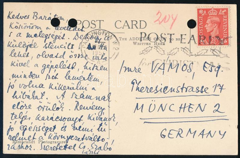 1951 London, Cs. Szabó László (1905-1984) Kossuth-díjas magyar író, esszéíró, kritikus autográf üdvözlő sorai, aláírással, képeslapon Vámos Imre (1927-1993) író, újságíró, parasztpárti politikus, a Látóhatár című folyóirat alapító szerkesztője, a Szabad Európa Rádió munkatársának részére. "Kedves Barátom" megszólítással.