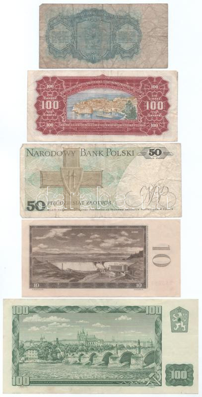 5pcs mixed lot of foreign banknotes, including Yugoslavia 1955. 100 Dinara + Czechoslovakia 1960. 10 Korun + 1961. 3 Korun + 100 Korun + Poland 1986. 50 Zlotych C:F fine paper -VG, typographical paint stains on the 100 Dinara