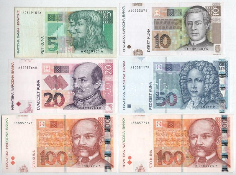 Croatia 1993-2012. 5 Kuna - 100 Kuna (6x) C:UNC, AU, with one F