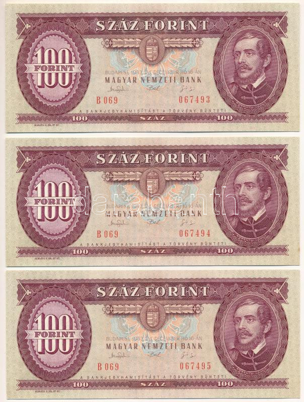 Leírás: 1993. 100Ft (3x) sorszámkövetők "B 069 067493 - B 069 067495" T:AU, hullámos papír, mindegyiken extra festék a hátoldalt felül