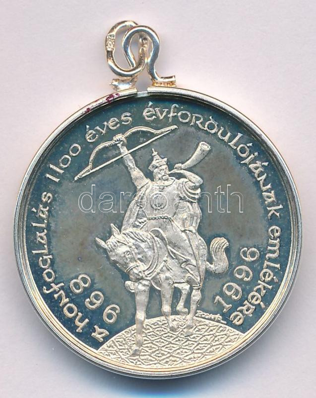 1996. "Millecentenárium - A honfoglalás 1100 éves évfordulójának emlékére - 896-1996 / Szent István királyunk és az első magyar pénz emlékére" kétoldalas jelzett Ag emlékérem foglalatban, füllel (br.6,94g/0.835/27mm) T:AU (eredetileg PP)