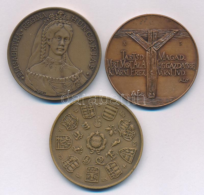Leírás: Csucs Viktória (1934-1993) 1979. "Magyar Éremgyűjtők Egyesülete 1969-1979 " kétoldalas bronz emlékérem (42,5mm) + Kelemen Kristóf (1922-2001) 1987. "MÉE / Erzsébet királyné születésének emlékére " kétoldalas bronz emlékérem (42,5mm) + Kiss Sándor (1925-) DN "MÉE / Körösfő Református Templom " kétoldalas bronz emlékérem (42,5mm) T:AU