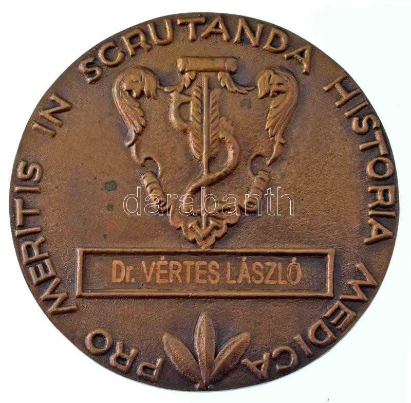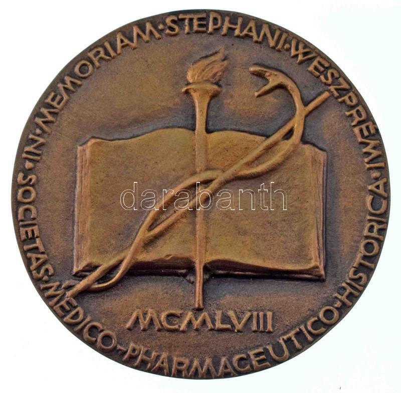 Reményi József (1887-1977) 1958. "IN MEMORIAM STEPHANI WESZPRÉMI - SOCIETAS MEDICO PHARMACEUTICO HISTORICA / PRO MERITIS IN SCRUTANDA HISTORIA MEDICA" hátoldalon névre szóló gravírozással, eredeti tokban (82mm) T:UNC, patina