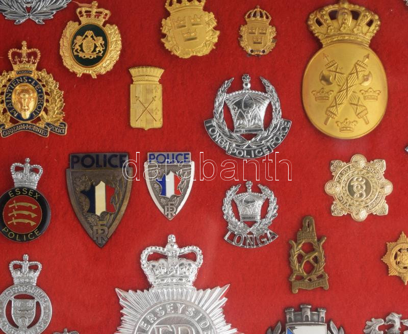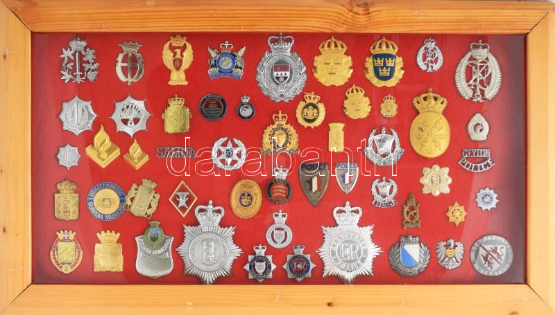Leírás: 20 ország katonai és rendőri sapkajelvényei összesen 52 db, üvegezett vitrinben 70x40 cm