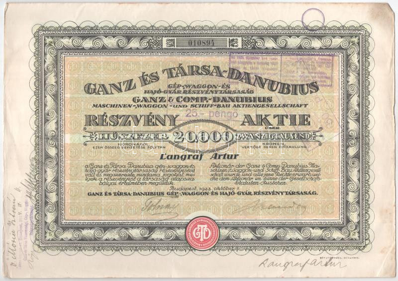 Budapest 1923. "Ganz és Társa- Danubius Gép-, Waggon- és Hajó-Gyár Részvénytársaság" részvénye 20.000K-ról, magyar és német nyelven, szárazpecséttel, bélyegzésekkel és szelvényekkel T:VF