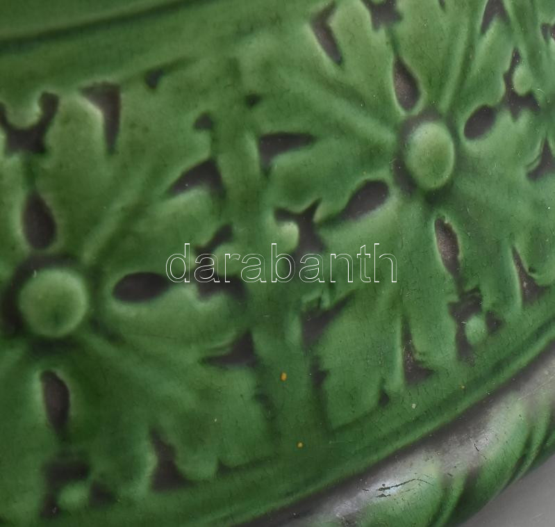 Zsolnay kaspó. Zöld mázzal fedett fehércserép, ismétlődő stilizált lev...