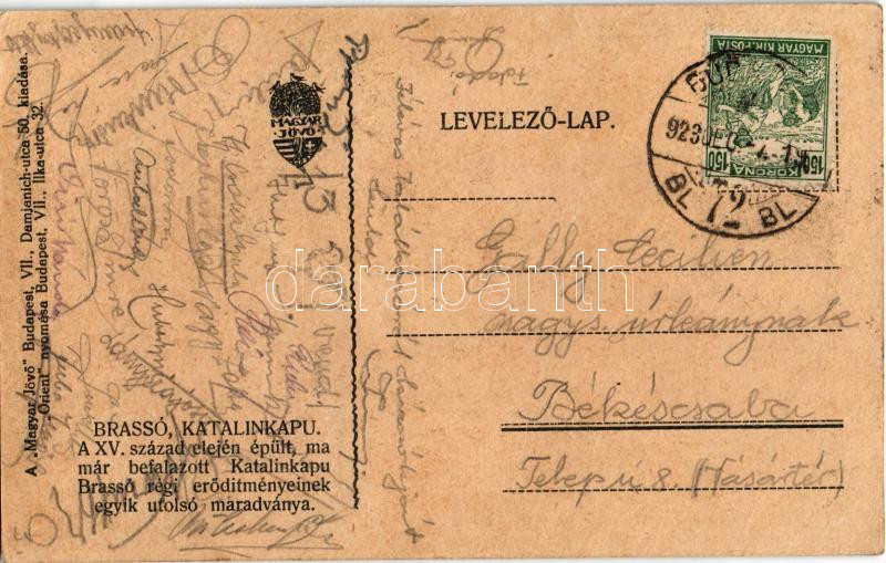 1923 Brassó, Kronstadt; Katalin-kapu, a XV. század elején épült, ma már befalazott Katalin-kapu Brassó régi erődítményeinek egyik utolsó maradványa. Kiadja a "Magyar Jövő" / Poarta Ecaterinei / gate, Hungarian irredenta, artist signed (r)