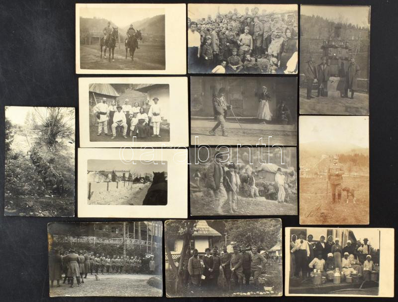 40 db RÉGI első világháborús osztrák-magyar katonai fotó képeslap és fotó saját tokban, közte sok a román frontról. Érdekes első világháborús dokumentáció, csoportképek, erdélyi tájképek, néprajzi felvételek is / 40 pre-1945 WWI K.u.K. military photo postcards and photos in their own case, many from the Romanian front. Interesting documentation from World War I, including group photos with soldiers, Transylvanian landscapes, and folklore