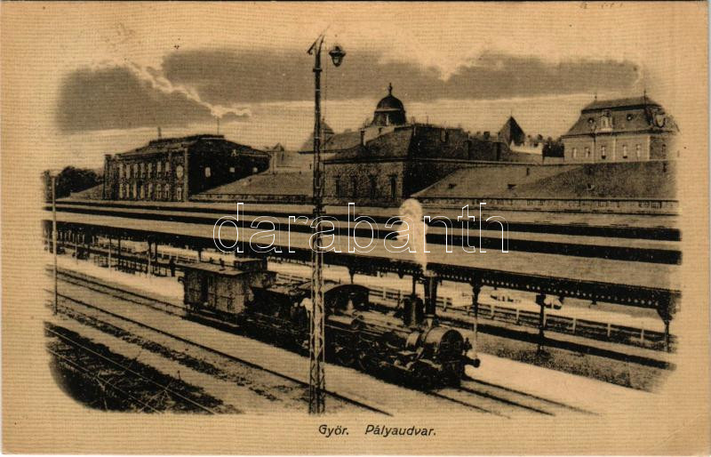 Leírás: 1928 Győr, pályaudvar, vasútállomás, gőzmozdony. Szántó Imre kiadása, K. J. Bp. 1919/23. (EK)
