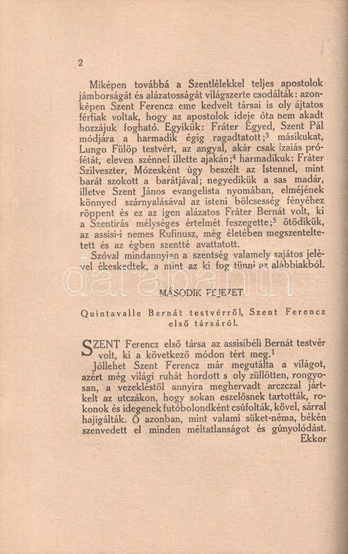 Az Assisi Szent Ferencről és szerzetestársairól szóló jámbor legendák gyűjteményét a XX. század első évtizedeiben hárman is lefordították, szépírók és irodalomtörténészek vegyesen (Erdős Renée, 1911; Kaposy József, 1913; Tormay Cécile, 1926). Példányunk a Kaposy József-féle jegyzetelt, tudós fordítás 1921. évi illusztrált díszkiadásából való, az egész oldalas fametszetek Végh Gusztáv grafikusművész munkái.