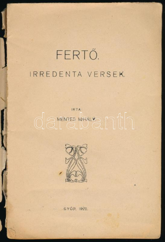 Mentes Mihály: Fertő. Irredenta versek. Győr, 1922, Szent István Társulat (Győregyházmegyei Alap-ny.), 108 p. Első kiadás. Kiadói papírkötés, kissé foltos, sérült borítóval, részben szétváló fűzéssel.