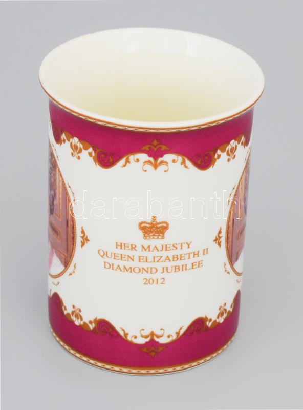 2012 Royal Crest II. Erzsébet brit királynő gyémántjubileum porcelán emlékbögre, újszerű állapotban, dobozában + 2021 Paris Match francia nyelvű újság II. Erzsébetről és Fülöp hercegről szóló száma
