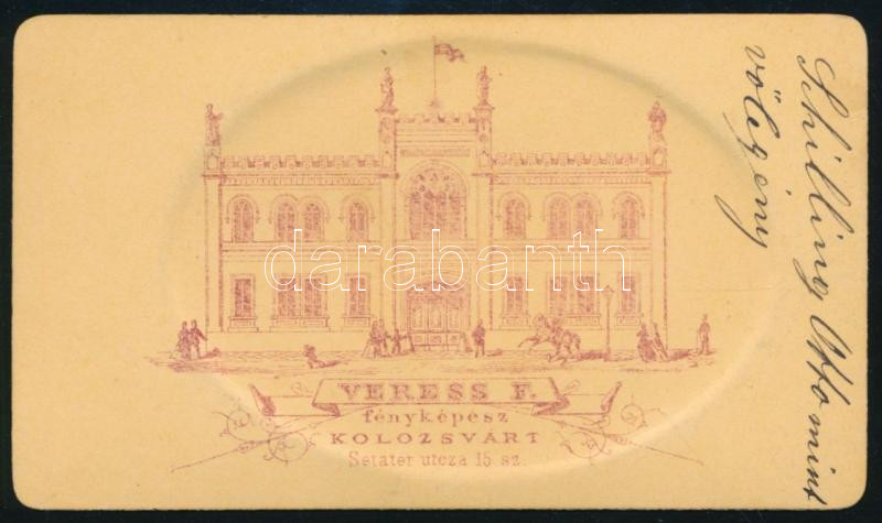 Leírás: cca 1865 Férfiportré, porcelánkép utánzatú keményhátú fotó Veress Ferenc (1832-1916) kolozsvári műterméből, hátoldalon a műterem képével, 10,5×6,5 cm