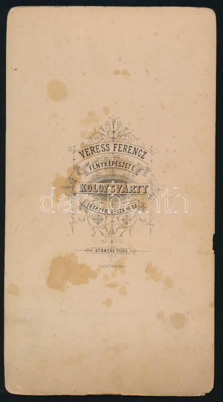Leírás: cca 1880-1890 Hölgy egészalakos portréja, kabinetfotó Veress Ferenc (1832-1916) kolozsvári műterméből, szélén kis sérüléssel, foltos, 21x11,5 cm