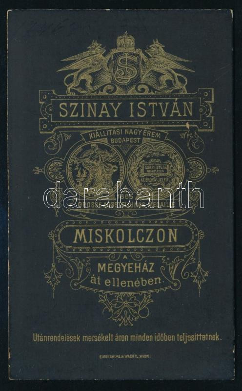 cca 1885-1890 Fiatal lány divatos kalapban, ,,Szinay Erzsike" felirattal (a fényképész családtagja?), vizitkártya Szinay István miskolci műterméből, dekoratív verzóval, 11x6,5 cm