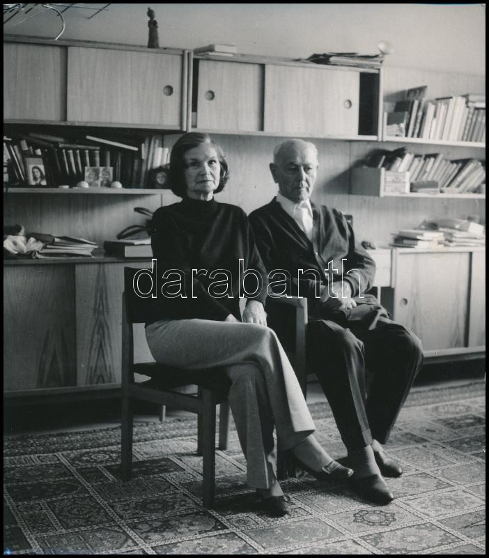 cca 1970 Komlós Aladár (1892-1980) Ãró, költÅ‘, műfordÃtó, irodalomtörténész és Palotai Erzsi (1907-1988) elÅ‘adóművész, Ãró, műfordÃtó kettÅ‘s portréja, Molnár Edit (1933-) Balázs Béla-dÃjas fotóművész hátoldalán jelzett fotója, bal felsÅ‘ sarkában töréssel, 20x17,5 cm