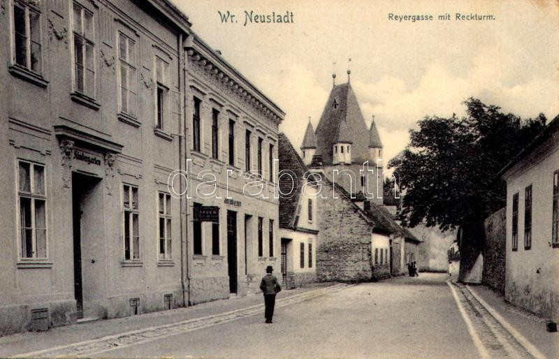 Wiener Neustadt, Bécsújhely; Reyergasse mit Reckturm, Kindergarten / street view, tower, kindergarten, shop of Johann Sauer. Verlag v. Karl Blumrich (small tear)