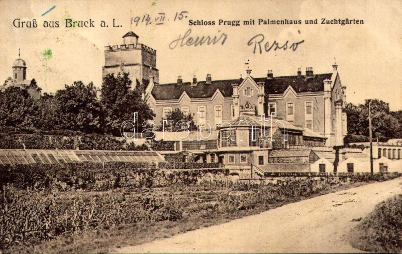 1914 Lajtabruck, Bruck an der Leitha; Schloss Prugg mit Palmenhaus und Zuchtgärten / Pálmaház a Prugg kastély kertjében. J. Sagl utóda O. Deyssig kiadása / palm house in the castle garden (fl)