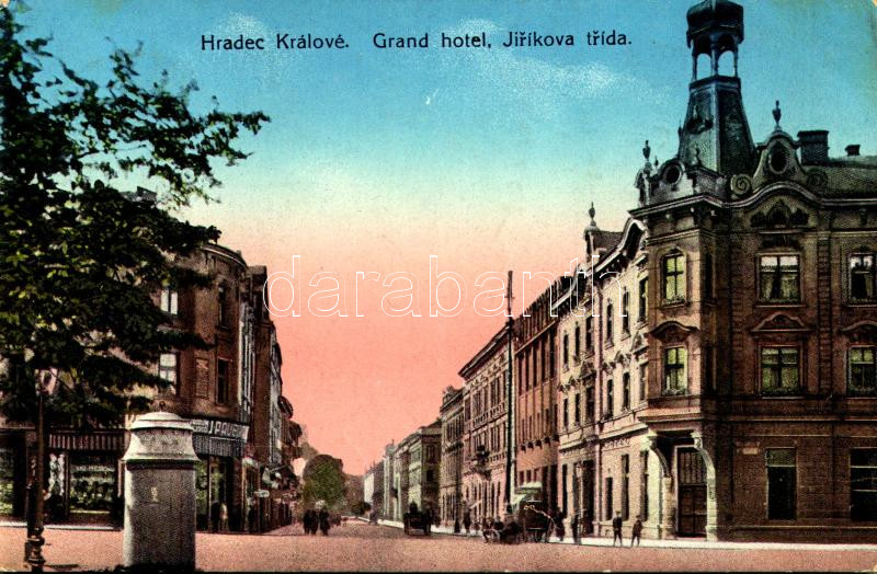 1915 Hradec Králové, Königgrätz; Jiríkova trída, Grand Hotel (Rb) https://www.darabanth.com/hu/491-Gyorsarveres/491.0/Kepeslapok/Cseh-Koztarsasag~1500029/1915-Hradec-Kralove-Koniggratz-Jirikova-trida-Grand-Hotel-Rb~II3187484