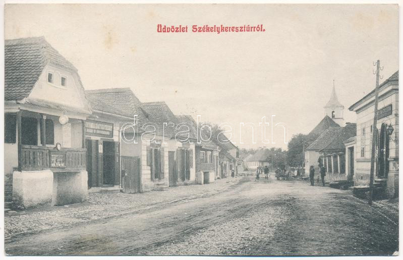1910 Székelykeresztúr, Kristur, Cristuru Secuiesc; utca, üzletek, Szabó Kálmán Könyvnyomda, könyvkötészet, írószer, könyvkereskedés és saját kiadása / street view, shops, publishing house (fl)