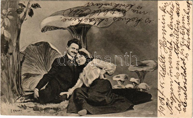 Leírás: 1904 Szerelmes pár gombák között / Romantic couple with mushrooms s: E. Ernst (Rb)