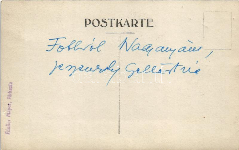 Abbazia, Opatija; elegáns hölgyek és egy úr kalapban, a jobb szélső nagyjeszeni Jeszenszky Gellértné Danilovics Aranka. Atelier Mayer felvétele / elegant ladies and a gentleman in hat. photo (tűnyomok / pinmarks)