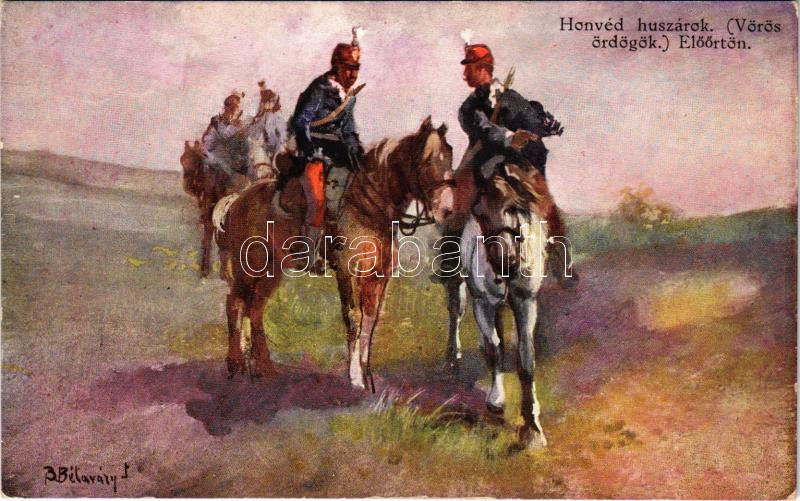 Leírás: Honvéd-Hussaren (genannt die roten Teufel) Vorposten / Honvéd huszárok (vörös ördögök) előőrsön / WWI Austro-Hungarian K.u.K. military art postcard, hussars. B.K.W.I. 889-6. s: B. Bélaváry