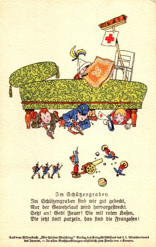 Im Schützengraben. Aus dem Bilderbuch "Wir spielen Weltkrieg!" / WWI Austro-Hungarian K.u.K. military art postcard. Children playing "World War". Offizielle Karte für Rotes Kreuz, Kriegsfürsogeamt, Kriegshilfsbüro Nr. 74-6. s: E. Kutzer (EK)