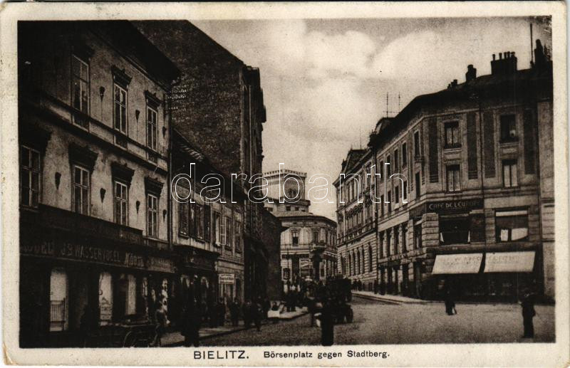 Leírás: 1915 Bielsko-Biala, Bielitz; Börsenplatz gegen Stadtberg / square, Café de l'Europe, shop of J. B. Wasservogel. Verlag W. Fröhlich (A. Hohn) (EK)