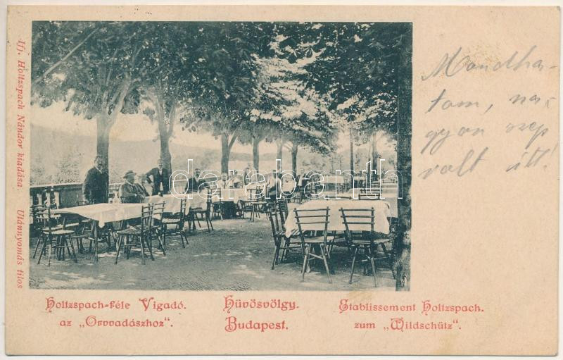 1901 Budapest II. Hűvösvölgy, Holtzspach-féle Vigadó az Orvvadászhoz, ... https://www.darabanth.com/hu/491-Gyorsarveres/491.0/Kepeslapok/Magyarorszag~1500005/1901-Budapest-II-Huvosvolgy-Holtzspach-fele-Vigado-az-Orvvadaszhoz-pincerek-es-vendegek~II3093717