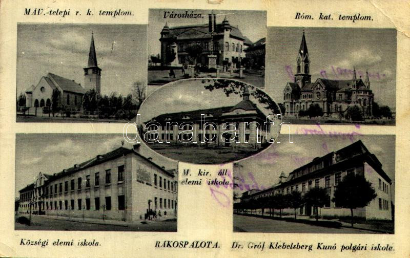 1942 Budapest XV. Rákospalota, MÁV telepi római katolikus templom, Városháza, Római katolikus templom, Községi elemi iskola, M. kir. állami elemi iskola, Dr. Gróf Klebelsberg Kunó polgári iskola (szakadás / tear)