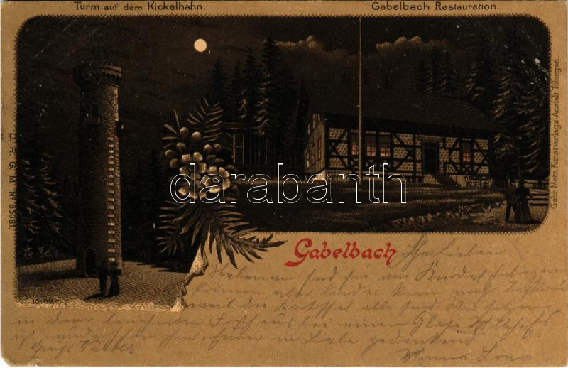 Leírás: 1899 (Vorläufer) Ilmenau, Gabelbach Restauration, Turm auf dem Kickelhahn / restaurant, lookout tower at night. Gebr. Metz Kunstverlags-Anstalt Art Nouveau, floral, litho (EK)