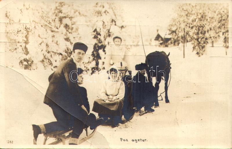 Leírás: 1909 Oslo, Christiania, Kristiania; Paa agetur / winter sport, sledding. photo (EB)