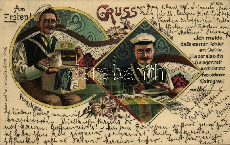1898 Fresskiste. Am Ersten! Am Letzten! Ich melde, dass es mir fehlet an Gelde, Habet also die Gelegenheit u. schicket mir nachstehende Kleinigkeit / Német grafikai élelmiszer doboz reklám / German "eating crate" advertisement card. Bruno Bürger & Ottillie Lith. Anst. No. 875. Art Nouveau, floral, litho