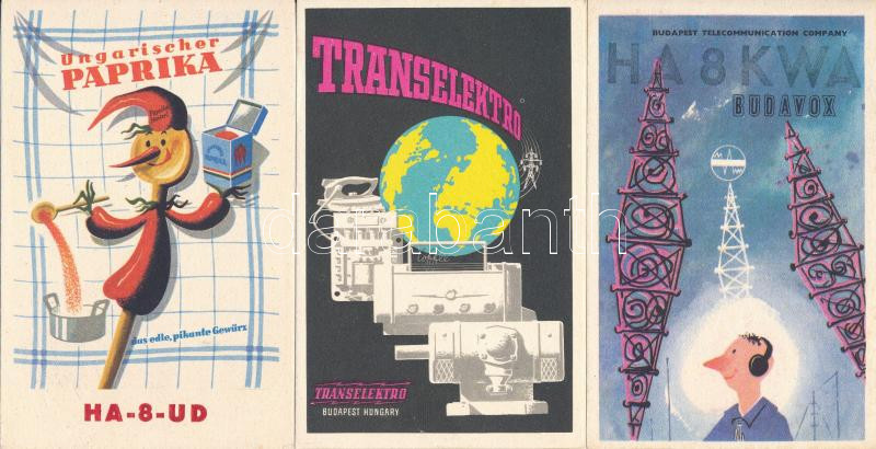 3 db modern magyar QSL, azaz rádióamatőr összeköttetést igazoló lap: Ungarischer Paprika, Budavox, Transelektro reklám / 3 MODERN Hungarian QSL, i.e. confirmation cards of a two-way communication between two amateur radio stations, advertisements