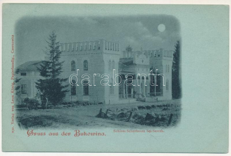 Serbauti, Scherboutz bei Sereth (Siret, Szeretvásár; Bukovina, Bucovina, Bukowina); Schloss Scherboutz. Verlag von Leon König (Czernowitz) / castle at night in moonlight (fl)